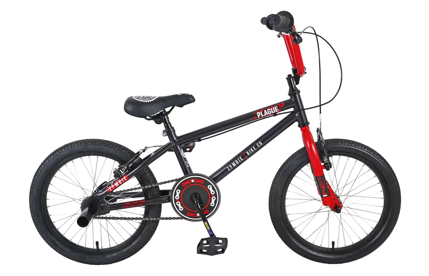 The 18″ wheel Zombie Plague is a superb first junior BMX and comes equipped with everything you need to learn the tricks that will enable you to ‘own’ the local skate park as you get older and move on to a bigger 20″ wheel. It comes complete with bombproof spoked alloy wheels for lightweight performance and a set of stunt pegs that can be mounted in any one of three configurations, so what are you waiting for? Get out riding! Suitable for smaller riders or age 7+ or an inside leg measurement